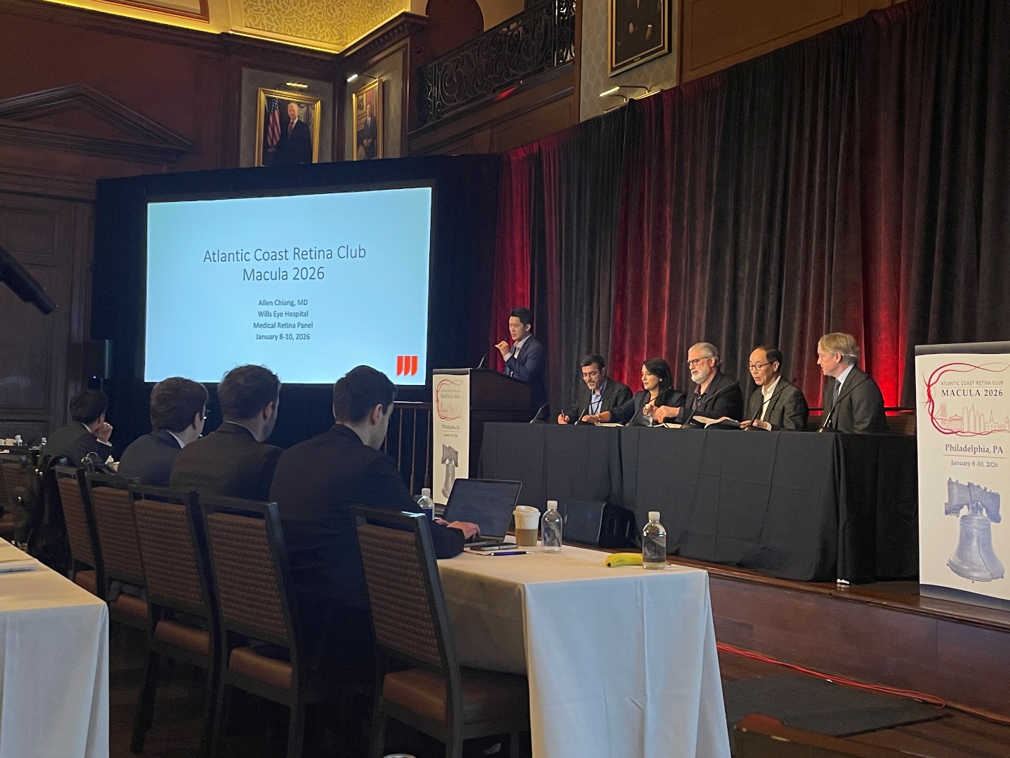 Last to speak was Dr. Sonia Mehta from Wills Eye Hospital. She presented a patient with breast and endometrial cancer with pancytopenia complaining of decreased vision in the right eye. The exam showed vitritis, vitreous hemorrhage, and chorioretinal whiting with elevation. The patient was treated with antibiotics two weeks prior without improvement. Given the initial lack of response, broad empiric therapy was initiated, including antifungal, anti-toxoplasmosis, and antiviral treatment. During this, an extensive systemic workup including blood cultures, PCR testing, echocardiogram, and other systemic imaging was undertaken. However, no causative organism or source was identified. The diagnosis was presumed endogenous fungal endophthalmitis because subsequent imaging following continued antifungal therapy demonstrated improvement in intraocular inflammation as well as the chorioretinal lesions. This case highlighted the diagnostic challenge of fungal infections, as blood cultures are only positive in 9-45% of cases and vitreous cultures in 25-55%.